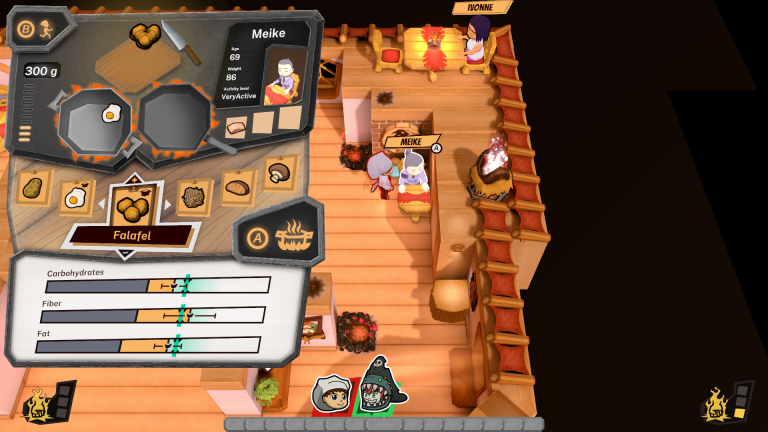 Zur Auswahl stehen sechs unterschiedliche Kochcharaktere mit eigenen Bewegungsfähigkeiten wie Dash oder Table Riding, was den Spielstil spürbar beeinflusst.